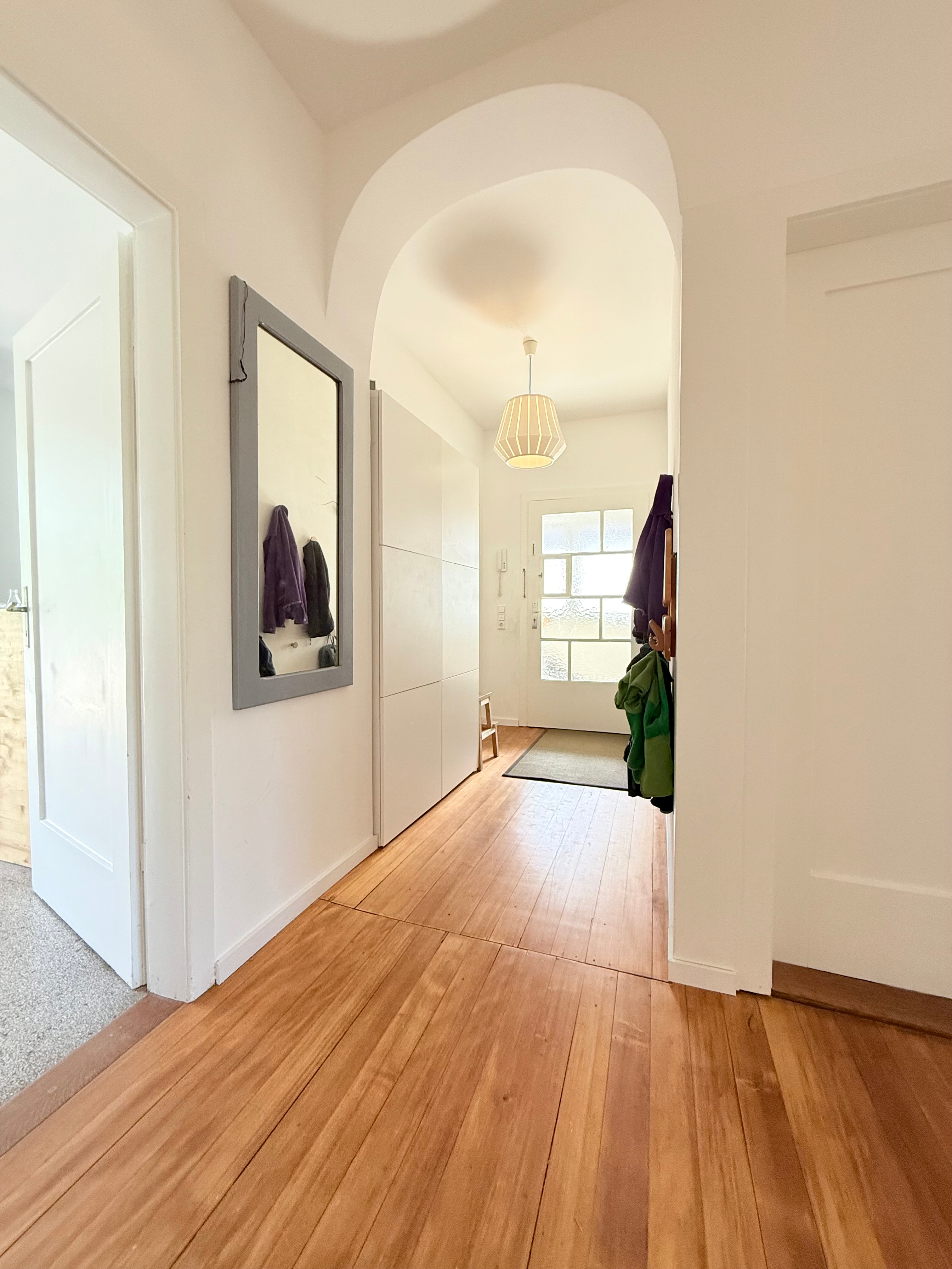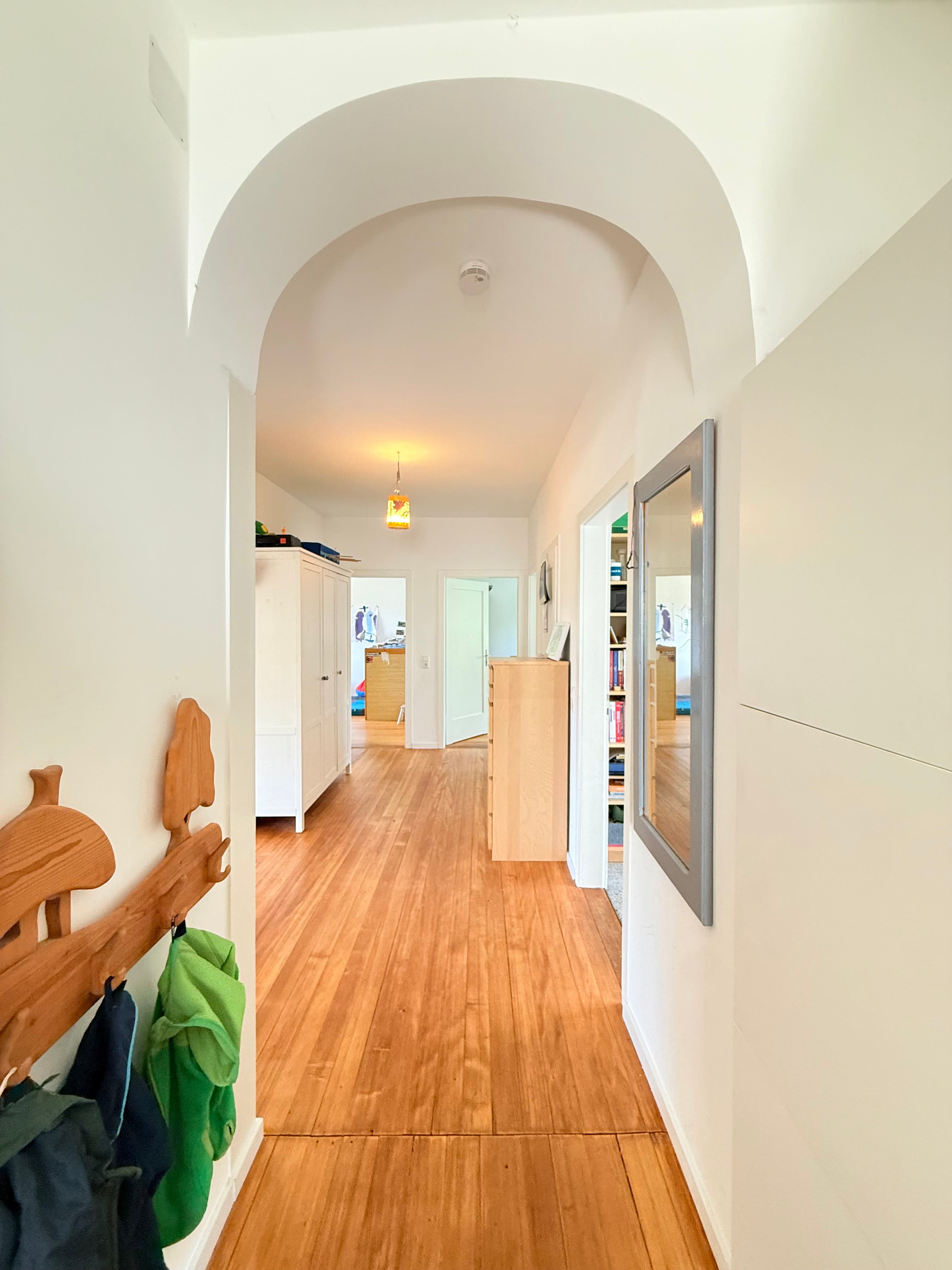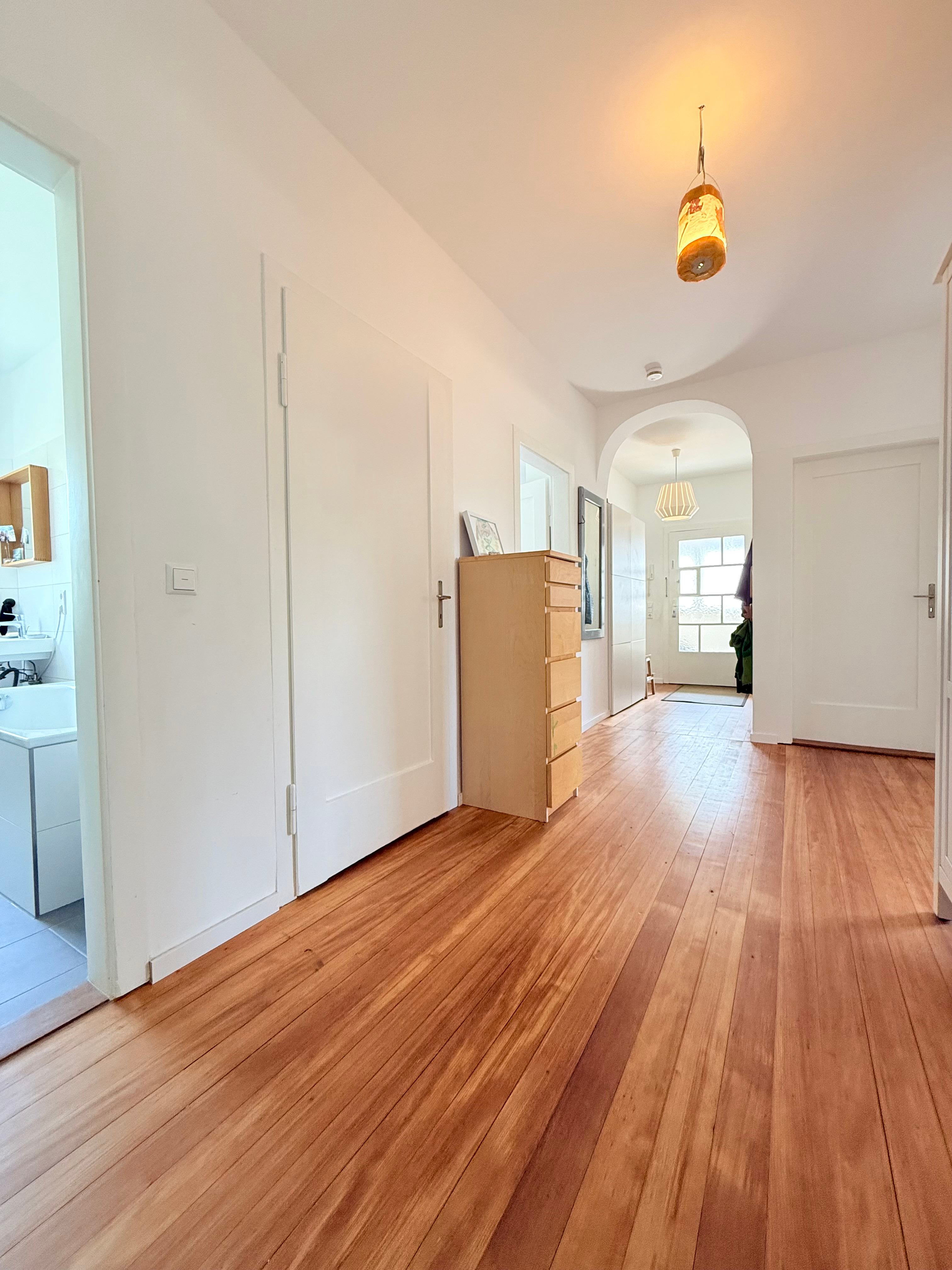 Beim Betreten der Wohnung empfängt Sie ein langer, eleganter Flur, der zentral durch die Wohnung führt. Gleich im Eingangsbereich unterstreicht ein imposanter Torbogen den besonderen Altbaucharakter. Vom Flur aus sind alle Räume direkt begehbar, was eine klare und großzügige Raumstruktur schafft.